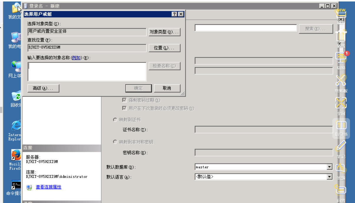 打开SQL Server登录属性对话框。在“常规”选项卡中,单击“名称”输入框右侧的按钮。