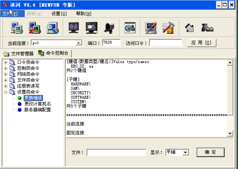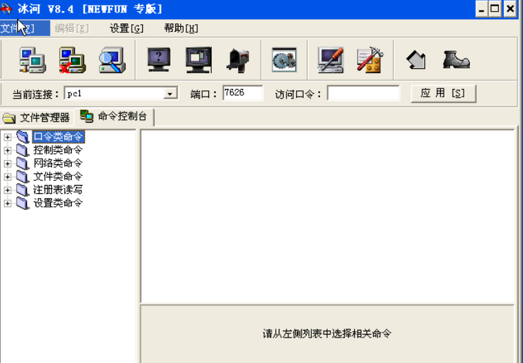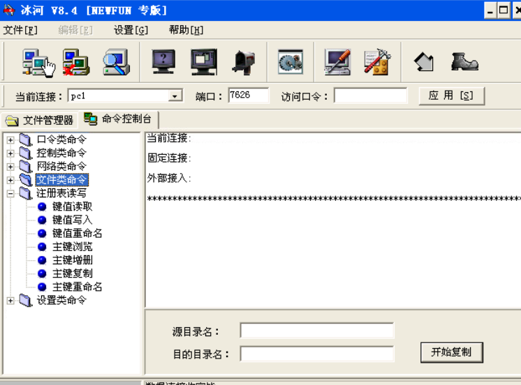 该类命令中,“文件浏览”、“文件查找”、“文件压缩”、“文件删除”、“文件打开”等菜单可以查看、查找、压缩、删除、打开远程主机上某个文件。“目录增删”、“目录复制”、可以增加、删除、复制远程主机上的某个目录。