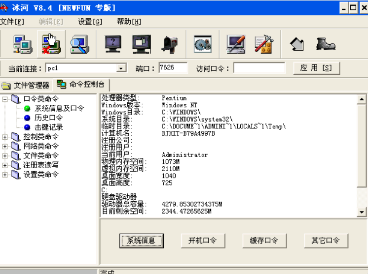 “系统信息及口令”:可以查看远程主机的系统信息,开机口令,缓存口令等。可看到非常详细的远程主机信息,这就无异于远程主机彻底暴露在攻击者面前