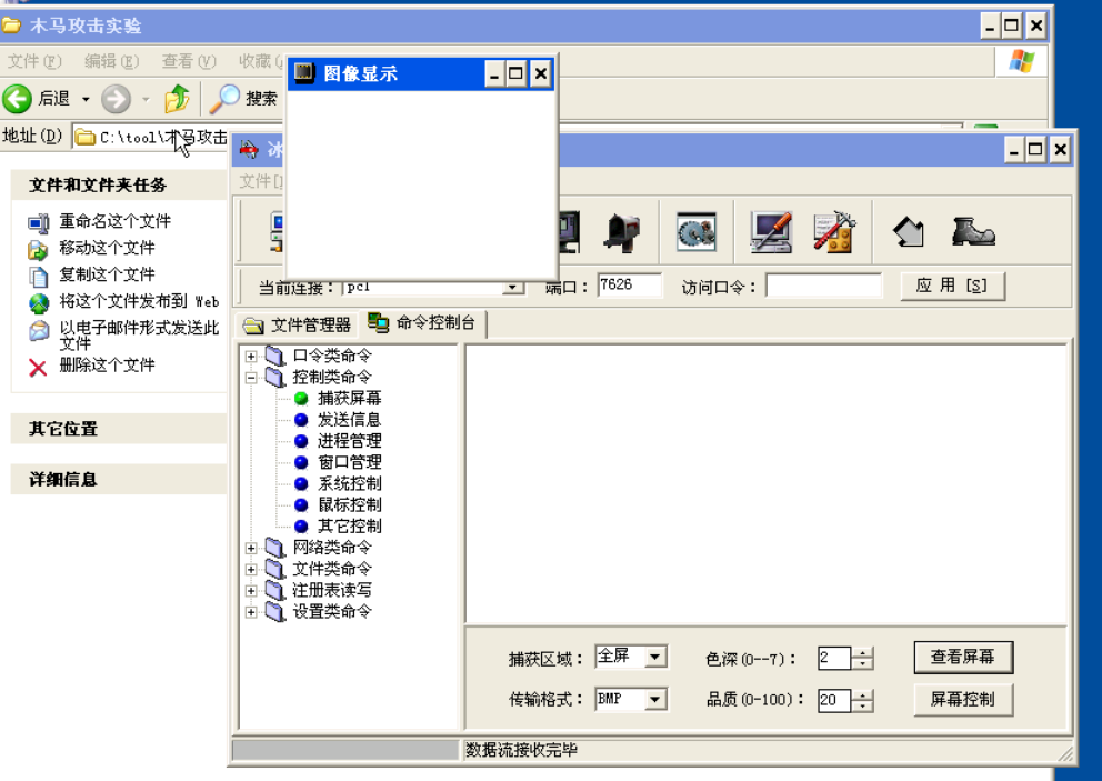 “捕获屏幕”:这个功能可以使控制端使用者查看远程主机的屏幕,好像远程主机就在自己面前一样,这样更有利于窃取各种信息,单击“查看屏幕”按钮,然后就染成了远程主机的屏幕。可以看到,远程主机屏幕上的内容就显示在本机上了,显示内容不是动态的,而是每隔一段时间传来一幅。