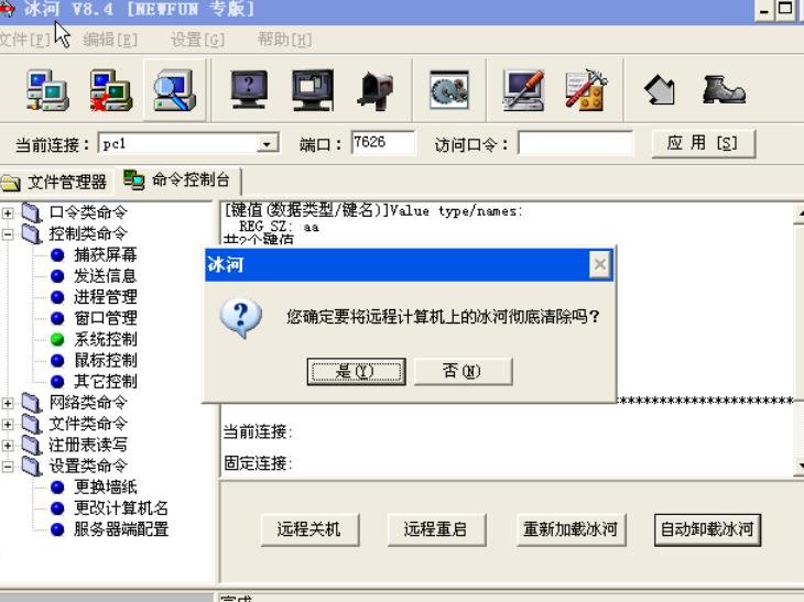 点击“控制类命令”前面的“+”,点击“系统控制”可看到“自动卸载冰河”按钮并点击,在弹出的窗口里面点击“是”,则可以卸载远程主机上的木马如图自动卸载冰河木马。