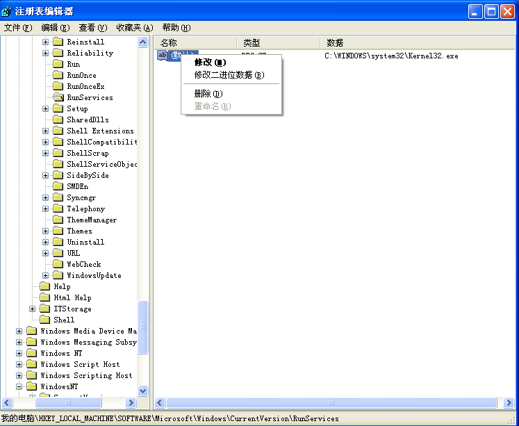 在目录中也发现了一个默认的键值C:\WINNT\System32\kernel32.exe,这也是“冰河”木马在注册表中加入的键值,将它删除如图。