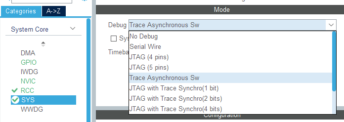 2、选择烧录方式 System Core ->SYS。这里我使用STLink烧录,选择SW方式,这里选择下图所示。使用JTAG选择对应的方式即可。