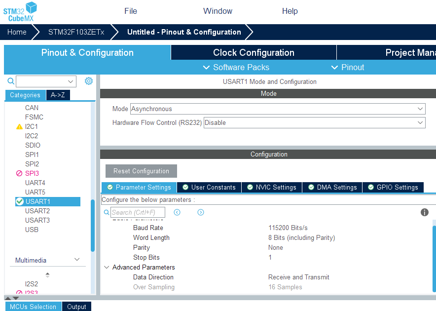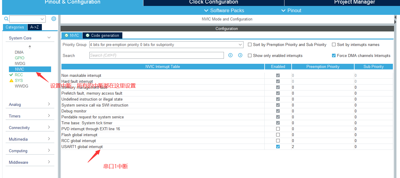 4、串口进行设置,Connectify目录下选择串口1设置好串口1的波特率,数据长度,停止位, 校验位,并在System Core目录下单的NVIC上设置串口1的中断,NVIC所有的中断都在这里设置了。