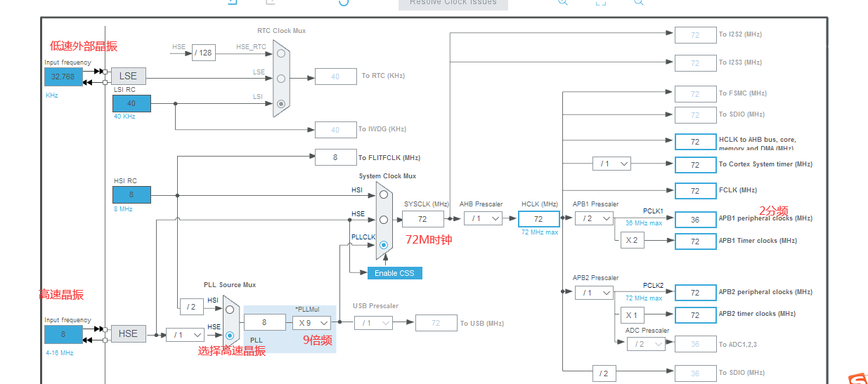1、时钟选择外部高速晶振配置成72M的最大速度。