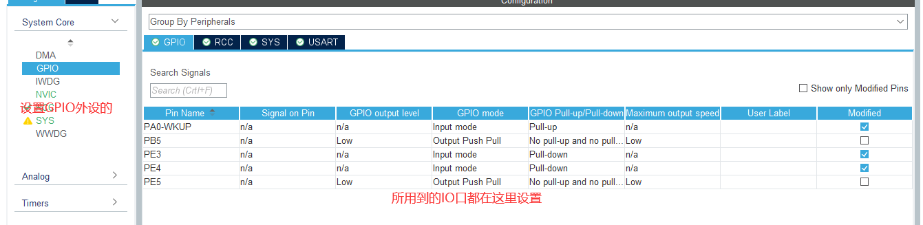3、配置外设,选择配置GPIO口完成点亮LED灯,配置串口打印调试信息。