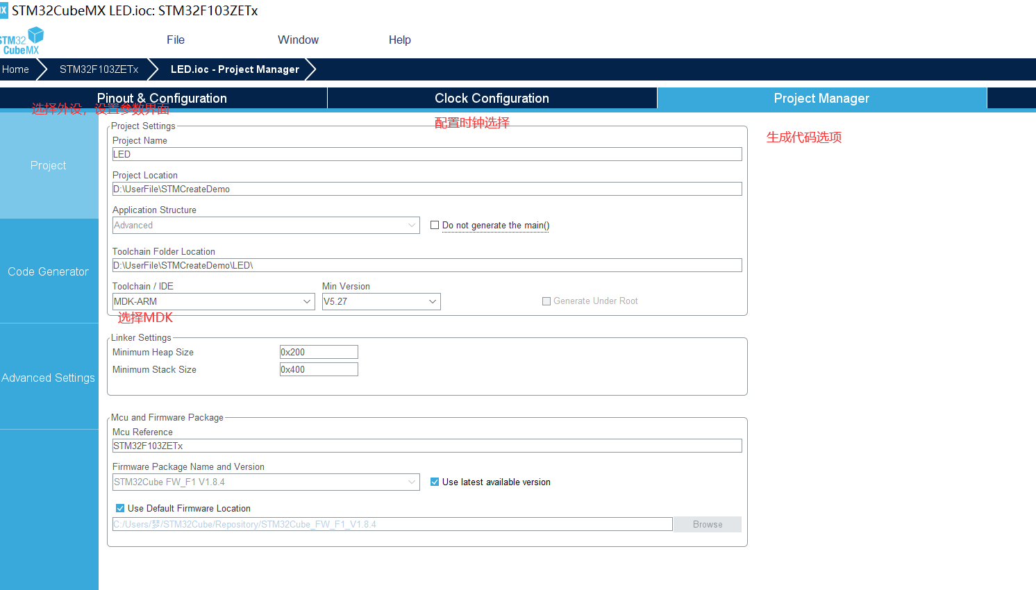 (3)最后选择这里生成代码。如果保存路径下没有中文是可以在生成后选择打开项目。如果路径中有中文,那么最后会提示有错误,此时我们可以去生成的路径自己打开。但是有时候生成的代码,编译之后会没有.S文件会报错,我们可以手动添加.S文件改正错误。当然这种情况都是有中文路径出现的,所以最好保存项目的路径不要有中文。