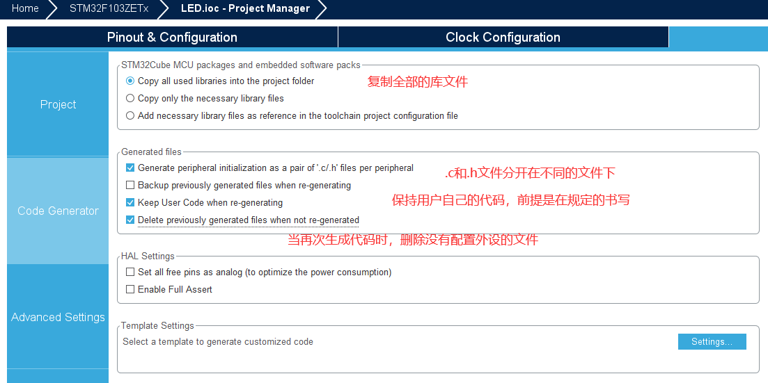 (2)这里是生成代码的常规设置,这里需要注意的是选择生成.c和.h分开,其他的都是默认的。可以根据说明自己选择需不要的一些功能。