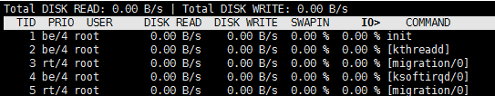 2、我们通过上面iostat的常用命令基本可以判断IO是否存在瓶颈了,然后我们通过iotop命令来抓出罪魁祸首的进程,这里比较简单直接输入命令,然后执行(一般抓到的是java进程、mysqld,干的越多问题越多)