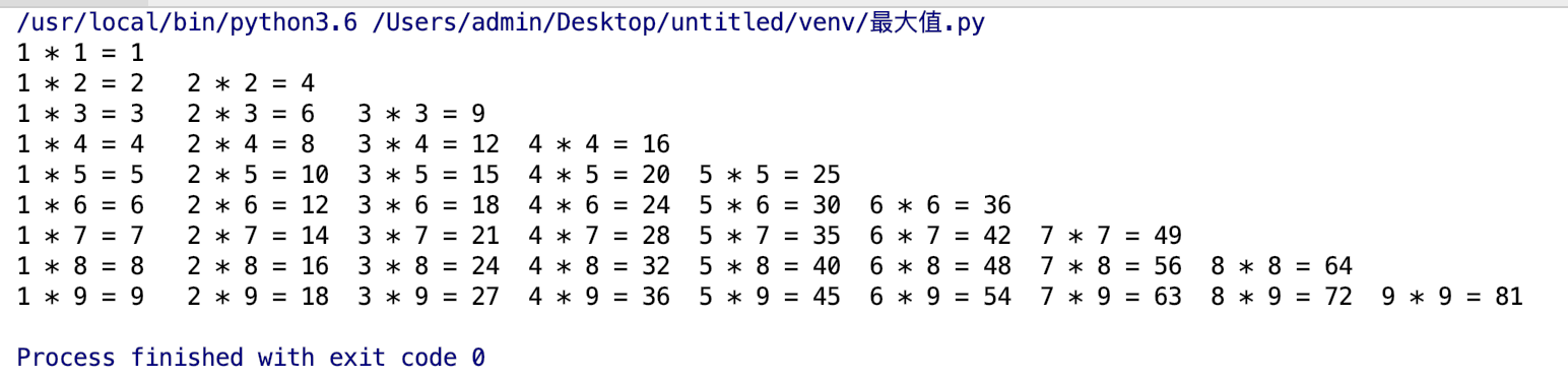 name1 = 1 while name1 <= 9: name2 = 1 while name2 <= name1: print(str(name2),"*",str(name1),"=",name2*name1,end="\t") # \t 表示制表符 \n 表示换行 name2 += 1 print() name1 += 1