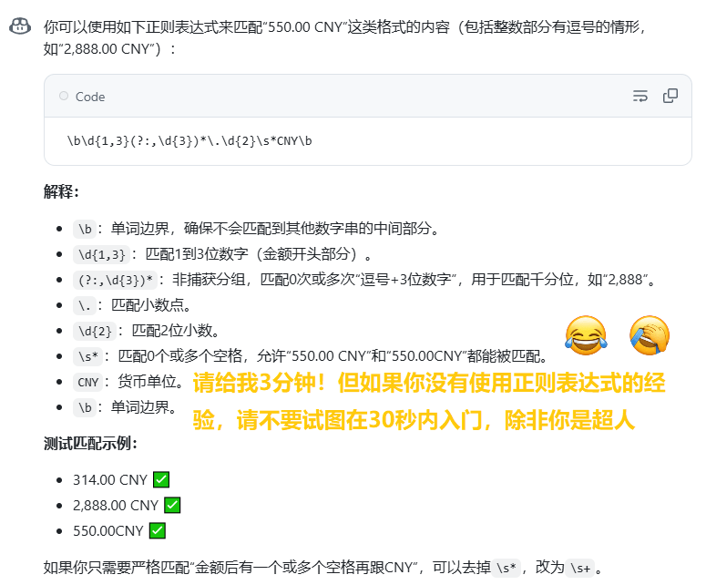如果你没有使用正则表达式的经验,请不要试图在阅读完本文后就能做到入门--除非你是超级天才,或者你不来至地球!本文3分钟可能就读完了,但离入门远远不够!除非特殊情况,请不要尝试精通正则表达式!但入门是必须的!你可以选择像我这样,知道入门语法后,通过AI编程来辅助你找到解决问题的思路!当然,类似的AI编程很多,大家自行选择。这里算是推一推我提供的服务: