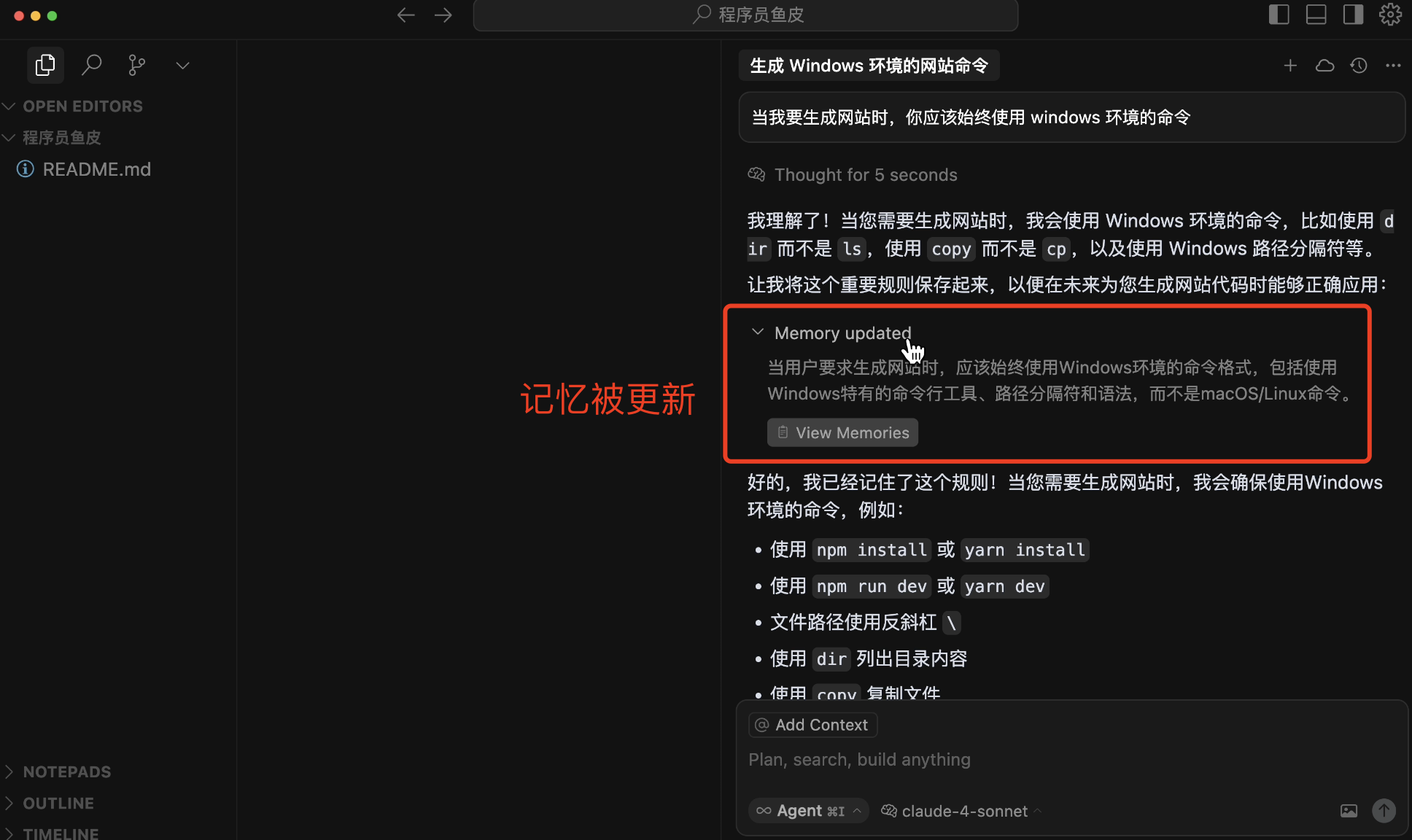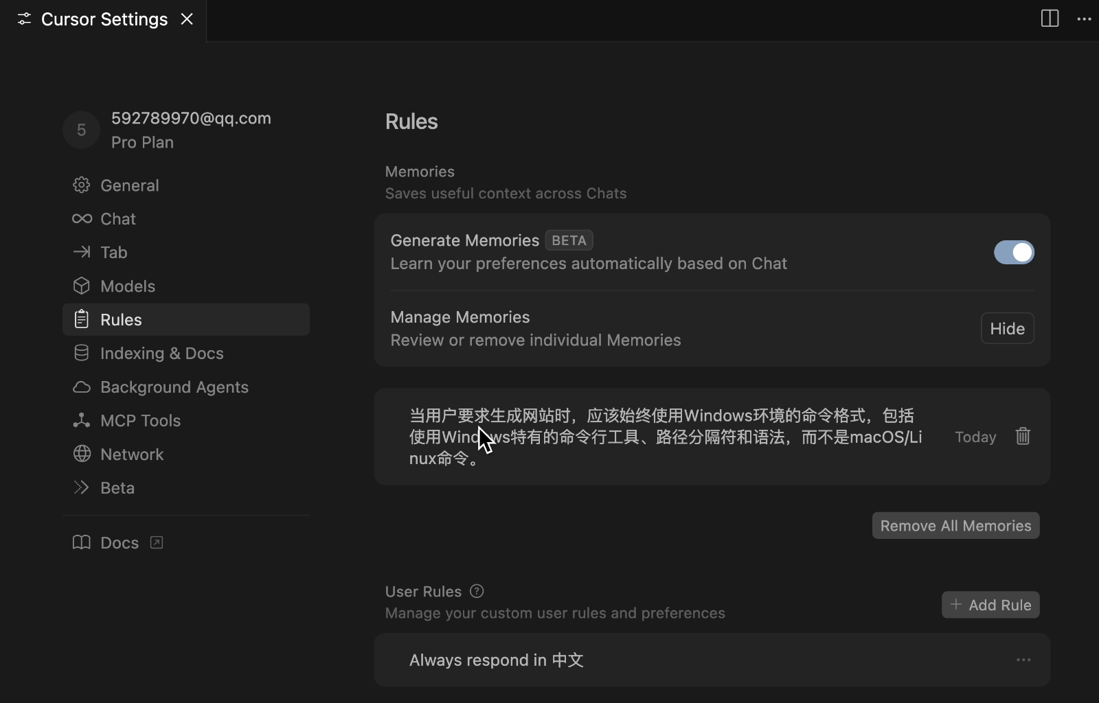 这个记忆功能和上下文对话历史(也就是聊天记录)是有区别的,不是什么都记,更多的是记忆规则。比如你经常使用某种代码风格,或者有特定的生成项目的要求,Cursor 会自动记住这些信息,在后续生成时主动应用。