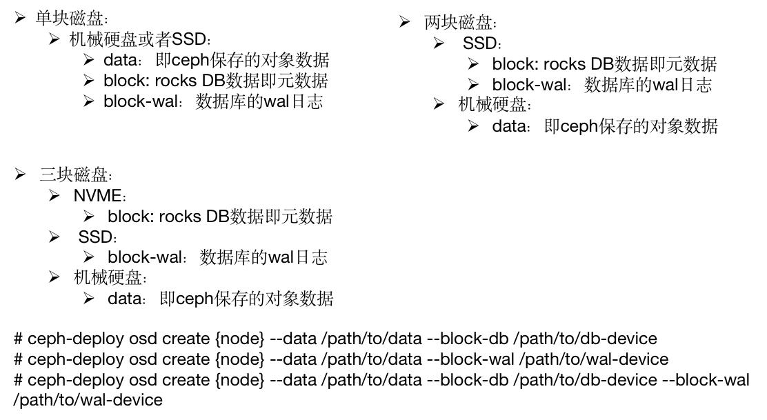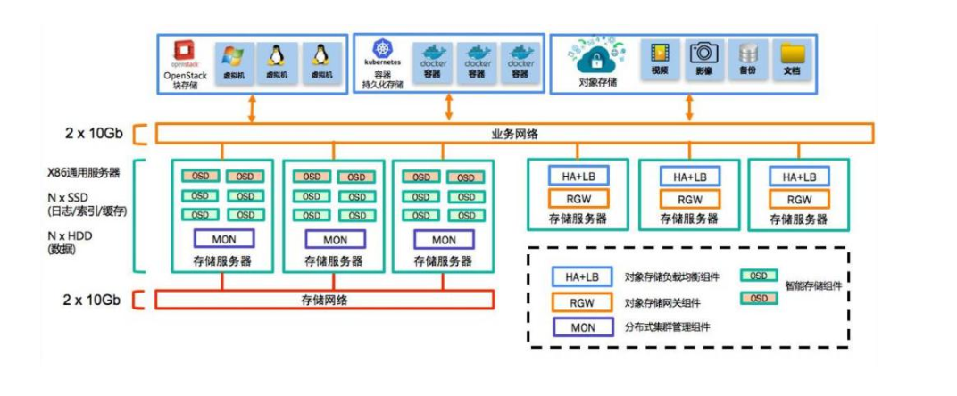 - osd存储服务:32核cpu 32g 内存 硬盘使用ssd 2块万兆网卡 (ssd容量和多少块 看个人需求来设定 没有准确数量但是每天台osd 不低于三块)