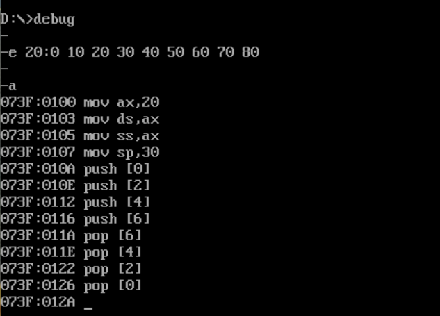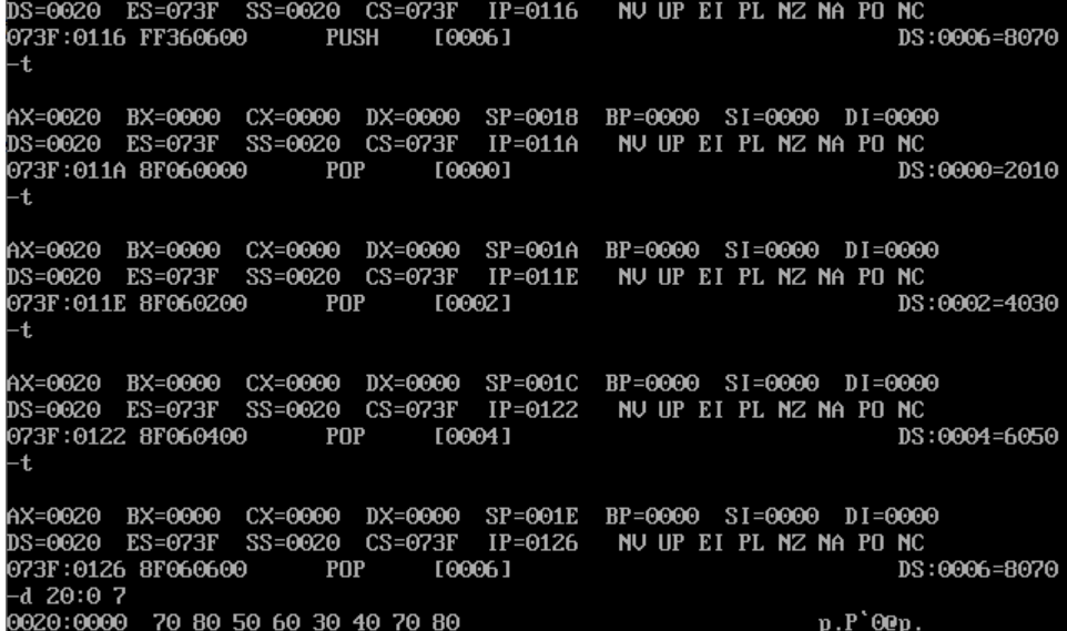 在debug环境中,按顺序录入以下内容,单步跟踪调试,观察寄存器和内存空间00200H~00207H,以