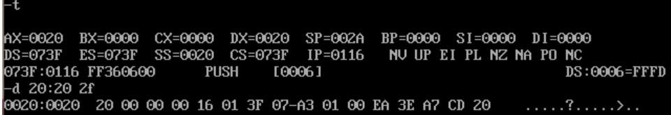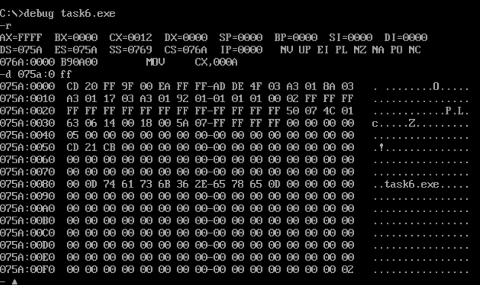 在debug中,使用d命令,查看task5.exe的程序段前缀,观察这256个字节的内容,验证前两个字节是