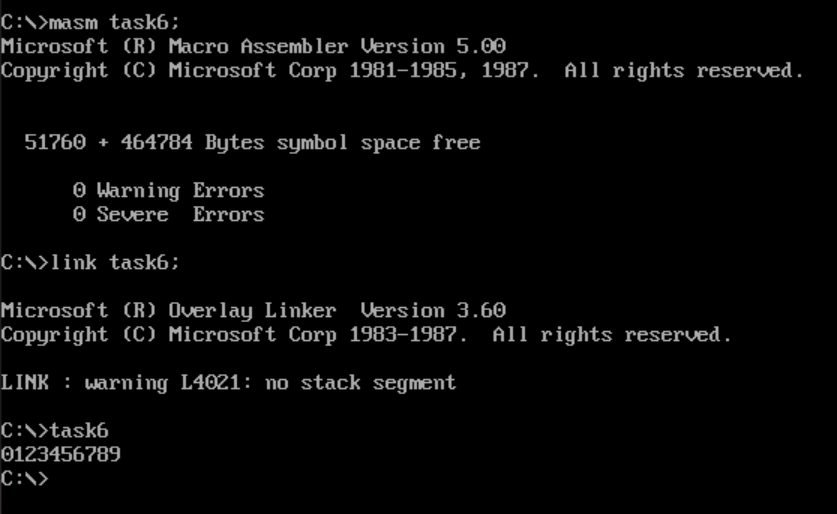 使用masm、link,汇编、链接,得到可执行文件task5.exe。运行程序。结合程序运行结果,理解程序