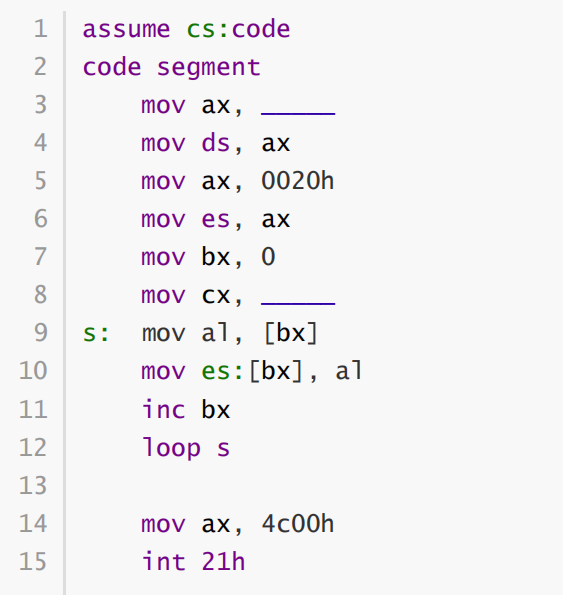 需要将程序段开始地址赋值给ds,即ax与cs一致,所以位cs。应填入需要复制的程序的长度。