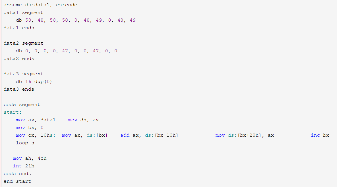 编程实现把逻辑段data1和逻辑段data2的数据依次相加,结果保存到逻辑段data3中。