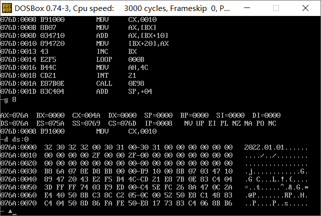 问题1:寄存器(DS) = 076C, 寄存器(SS) = 076E, 寄存器(CS) = 076A