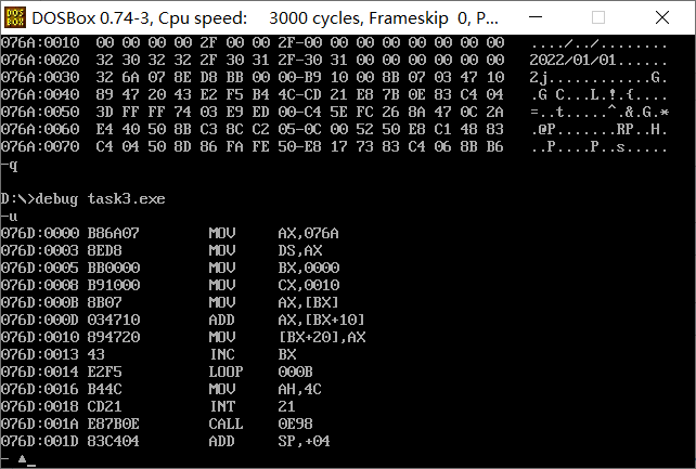在debug中加载、反汇编、调试。在数据项依次相加前,和相加后,分别查看三个逻辑段data1, data2, data3对应的内存空间,确认逐一相加后,结果的确保存在了逻辑段data3中。