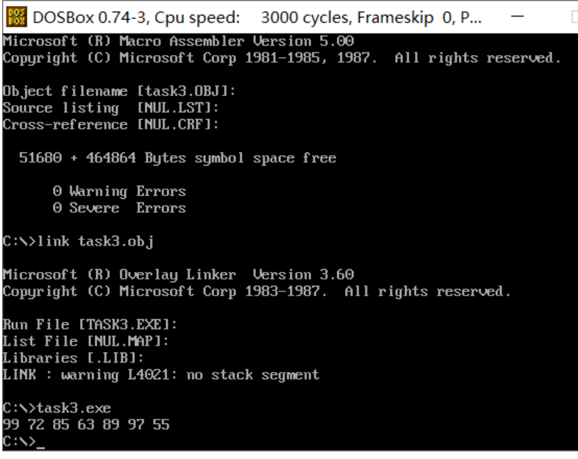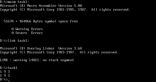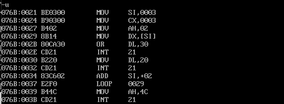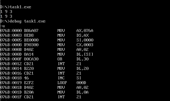 1 assume cs:code, ds:data 2 3 data segment 4 x db 1, 9, 3 5 len1 equ $ - x 6 7 y dw 1, 9, 3 8 len2 equ $ - y 9 data ends 10 11 code segment 12 start: 13 mov ax, data 14 mov ds, ax 15 16 mov si, offset x 17 mov cx, len1 18 mov ah, 2 19 s1:mov dl, [si] 20 or dl, 30h 21 int 21h 22 23 mov dl, ' ' 24 int 21h 25 26 inc si 27 loop s1 28 29 mov ah, 2 30 mov dl, 0ah 31 int 21h 32 33 mov si, offset y 34 mov cx, len2/2 35 mov ah, 2 36 s2:mov dx, [si] 37 or dl, 30h 38 int 21h 39 40 mov dl, ' ' 41 int 21h 42 43 add si, 2 44 loop s2 45 46 mov ah, 4ch 47 int 21h 48 code ends 49 end start