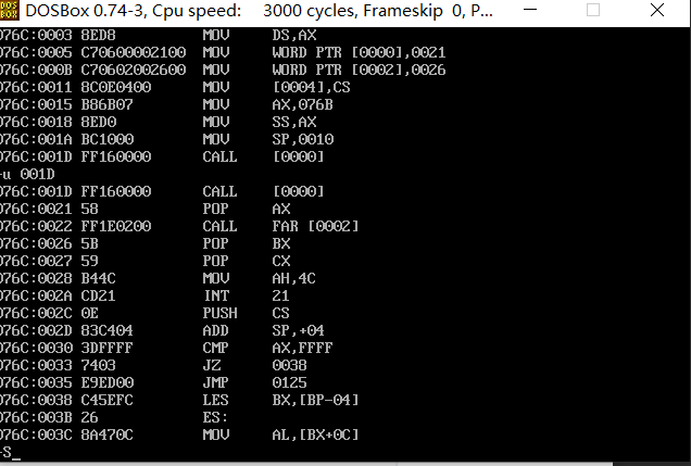 call dword ptr ds:[2] 指令将下一条指令的cs:ip压入栈,然后将ip 和cs依次出栈到bx,cx中,故bx-0026 cx=076c