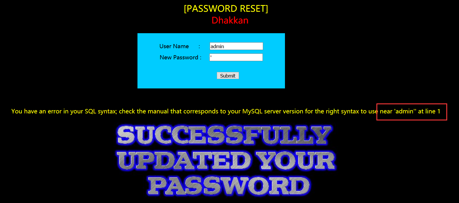 这里我们看到有报错信息显示出来了,那我们就可以用前面的报错注入来进行,password位置输入: