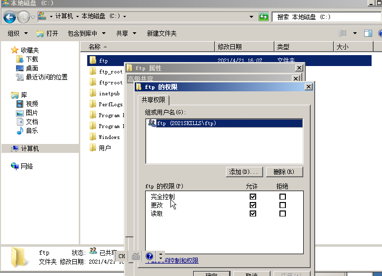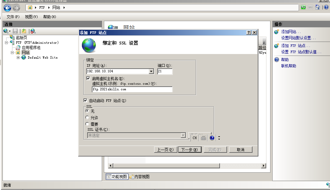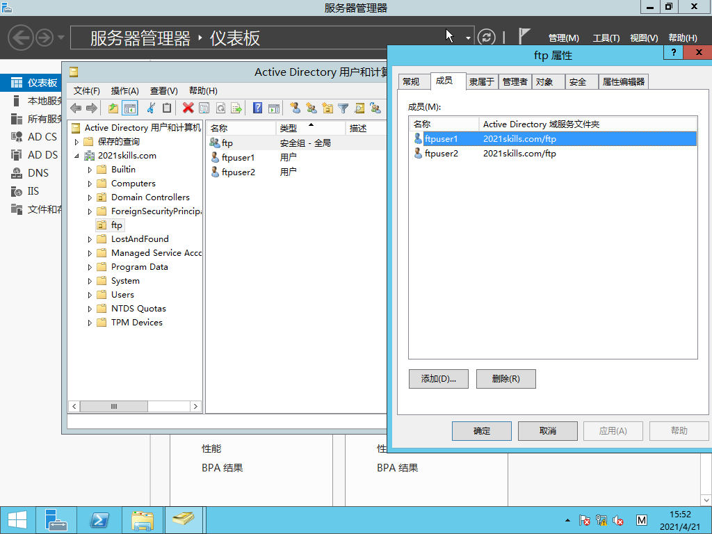 - 将FTP服务器加入域控制器中,其完全域名为ftp.2021skills. com