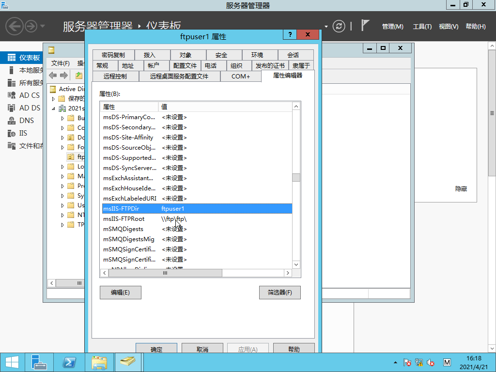 10.选择用户-属性-属性编辑器修改msIIS-FTPRoot和msIIS-FTPDir