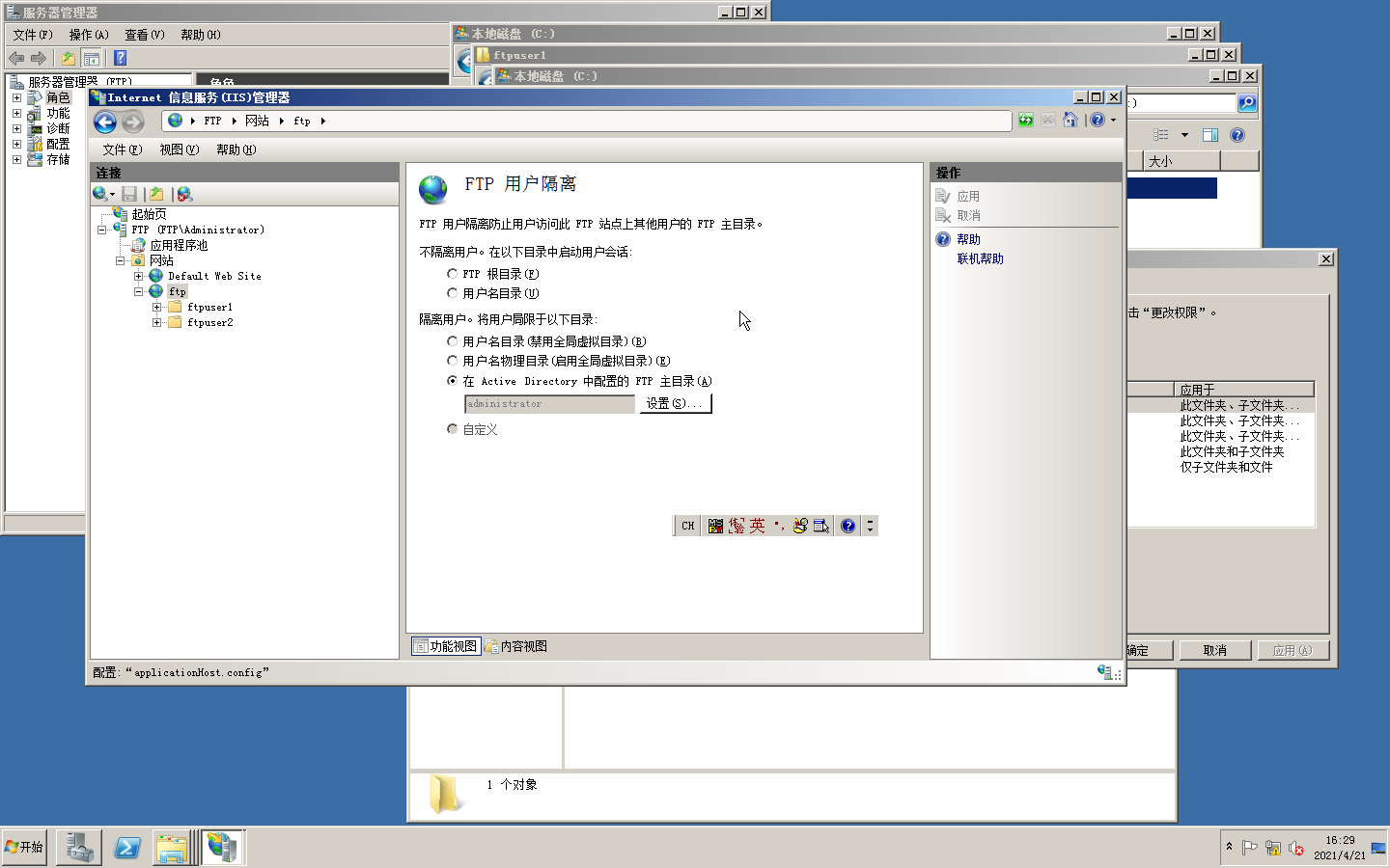 - 为ftp1.2020skills.com设置域用户隔离,在域控制器中创建域用户ftpuser1和ftpuser2,密码为2020skills. com,设置两个用户主目录分别为网络文件夹\\ftp\ftpuser1、\\ftp\ftpuser2。