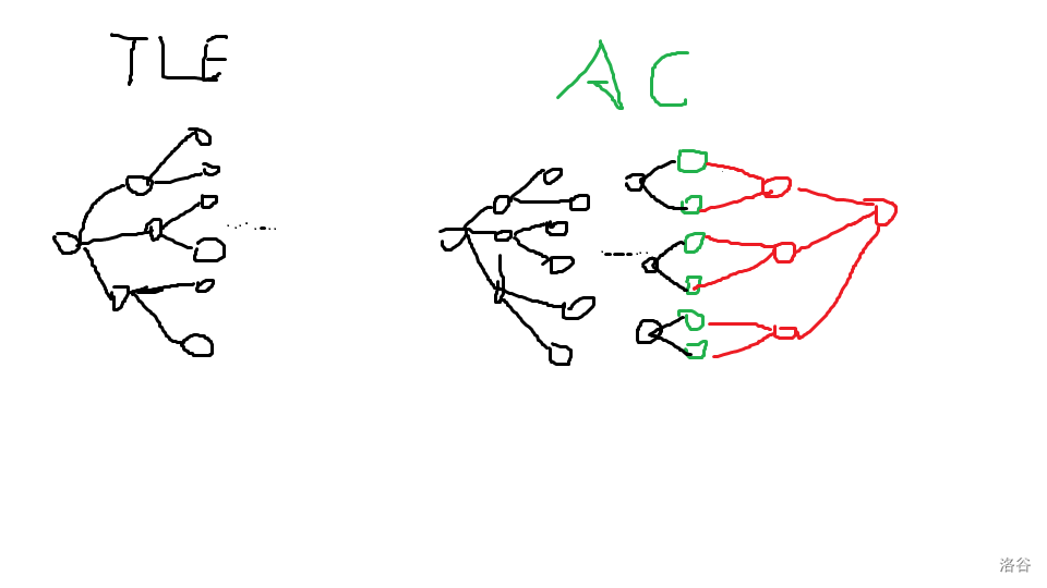 双向广搜,顾名思义,就是从起点和终点两个方向进行广搜,直到它们相遇。为什么复杂度会降低呢?这里放一张图片(画得有点丑,见谅):