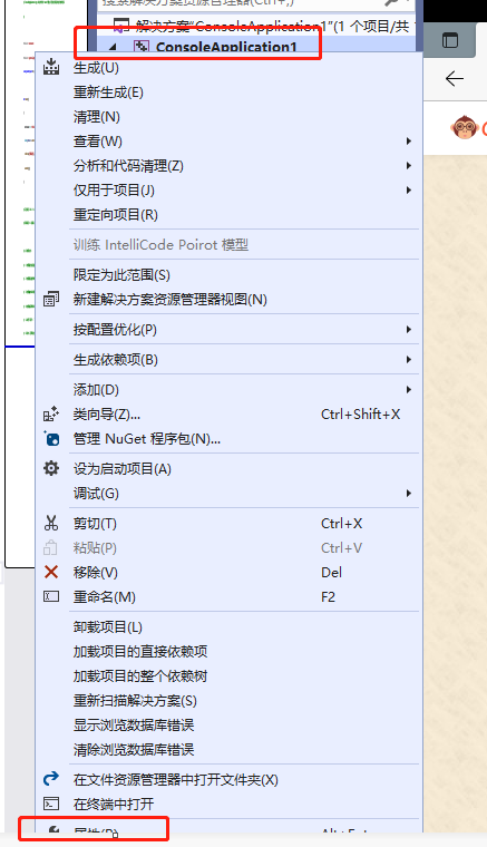 3)选中项目名称,右键,选择属性。
