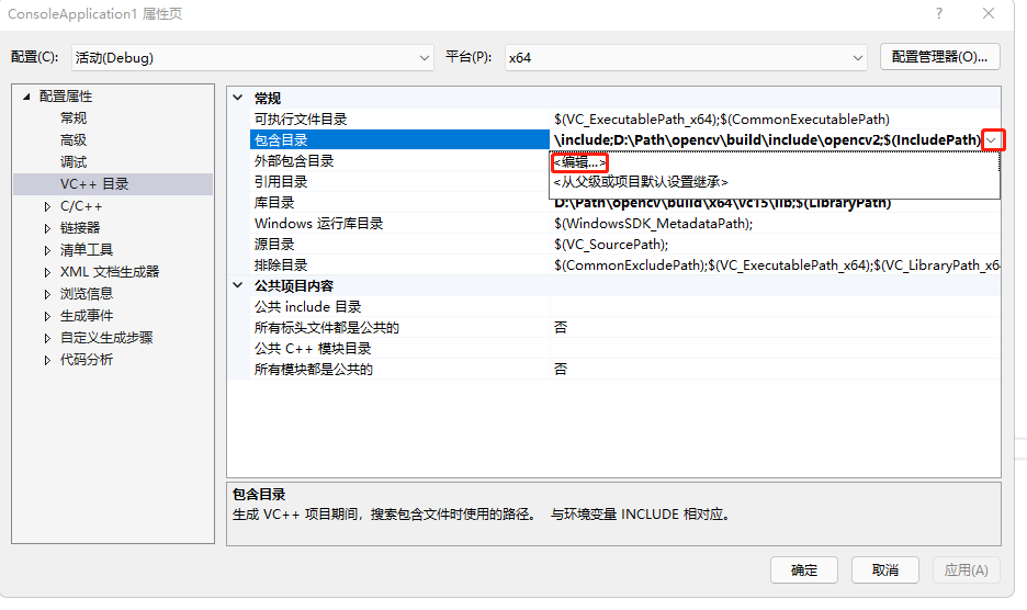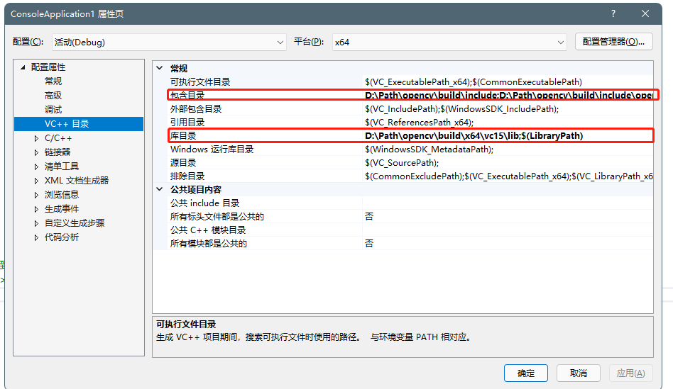5)“配置属性”-“VC++ 目录”:需要配置“包含目录”和“库目录”。