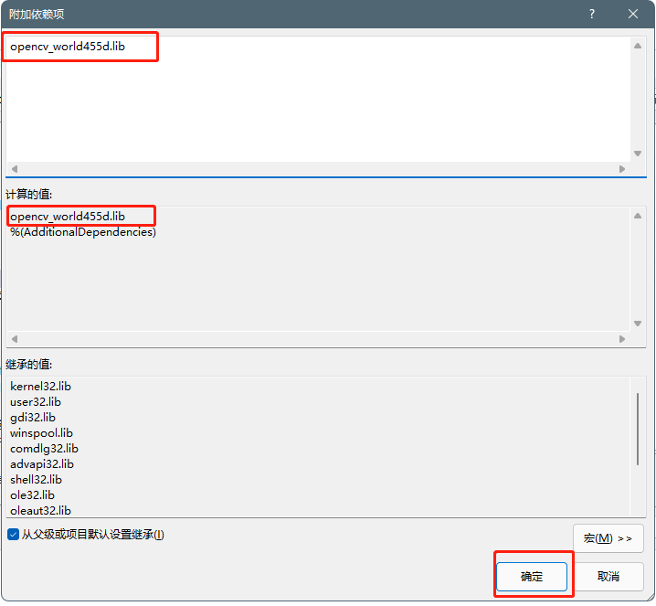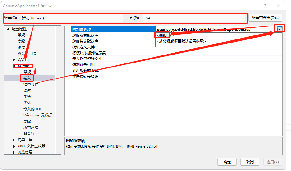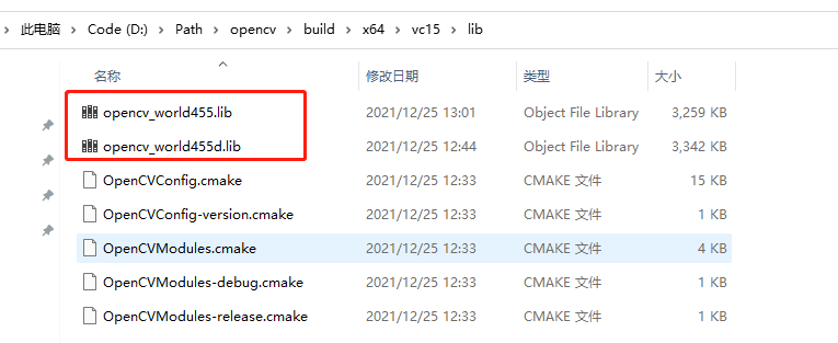 10)获取名称,根据路径。如果选择debug模式则选择带“d”的链接库,否则选择不带“d”的链接库。示例中,复制名称:opencv_world455d.lib