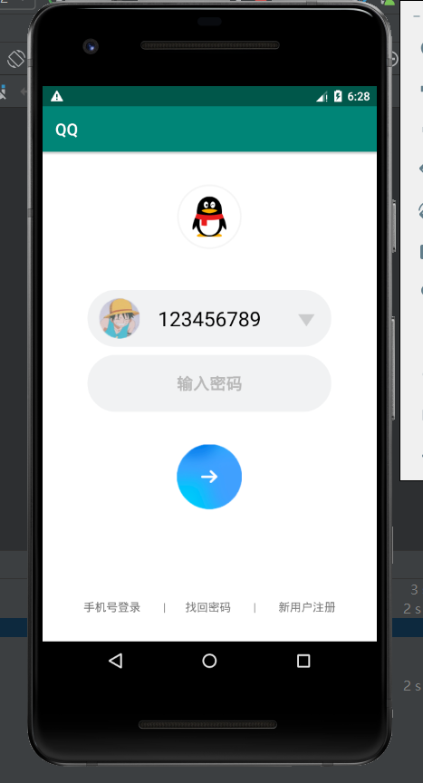 1 <?xml version="1.0" encoding="utf-8"?> 2 <RelativeLayout xmlns:android="http://schemas.android.com/apk/res/android" 3 xmlns:app="http://schemas.android.com/apk/res-auto" 4 xmlns:tools="http://schemas.android.com/tools" 5 android:layout_width="match_parent" 6 android:layout_height="match_parent" 7 android:orientation="vertical" 8 android:background="#FFFFFF"> 9 10 <ImageView 11 android:id="@+id/Tu_1" 12 android:layout_width="80dp" 13 android:layout_height="80dp" 14 android:background="@drawable/tx" 15 android:layout_centerHorizontal="true" 16 android:layout_marginTop="40dp"/> 17 18 <ImageView 19 android:layout_width="50dp" 20 android:layout_height="50dp" 21 android:background="@drawable/tb" 22 android:layout_marginTop="180dp" 23 android:layout_marginLeft="70dp"/> 24 25 <ImageView 26 android:layout_width="20dp" 27 android:layout_height="15dp" 28 android:background="@drawable/xx" 29 android:layout_marginTop="200dp" 30 android:layout_marginLeft="315dp"/> 31 32 <TextView 33 android:layout_width="300dp" 34 android:layout_height="70dp" 35 android:layout_centerHorizontal="true" 36 android:layout_marginTop="170dp" 37 android:background="@drawable/edi_1" 38 android:text="123456789" 39 android:gravity="center" 40 android:textSize="25sp" 41 android:textColor="#000000" /> 42 43 <EditText 44 android:layout_width="300dp" 45 android:layout_height="70dp" 46 android:layout_centerHorizontal="true" 47 android:layout_marginTop="250dp" 48 android:background="@drawable/edi_1" 49 android:text="输入密码" 50 android:gravity="center" 51 android:textSize="20sp" 52 android:textColor="#B8B8B8" 53 android:textStyle="bold"/> 54 55 <ImageButton 56 android:layout_width="80dp" 57 android:layout_height="80dp" 58 android:background="@drawable/dl" 59 android:layout_centerHorizontal="true" 60 android:layout_marginTop="360dp"/> 61 62 <TextView 63 android:layout_width="match_parent" 64 android:layout_height="match_parent" 65 android:text="手机号登录 | 找回密码 | 新用户注册" 66 android:gravity="center_horizontal" 67 android:layout_marginTop="550dp"/> 68 </RelativeLayout>