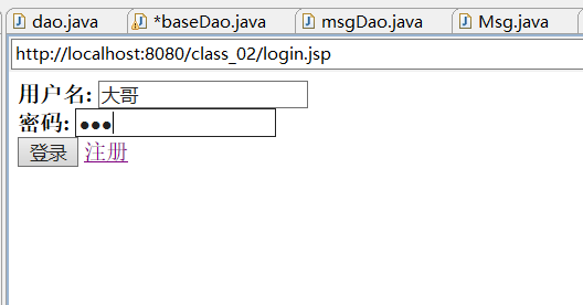 1 <%@ page language="java" contentType="text/html; charset=utf-8" 2 pageEncoding="utf-8"%> 3 <!DOCTYPE html PUBLIC "-//W3C//DTD HTML 4.01 Transitional//EN" "http://www.w3.org/TR/html4/loose.dtd"> 4 <html> 5 <head> 6 <meta http-equiv="Content-Type" content="text/html; charset=utf-8"> 7 <title>Insert title here</title> 8 </head> 9 <body> 10 <form action="doreg.jsp" method="post"> 11 <b>用户名</b> 12 <input type="text" name="uname" /> 13 <br /> 14 <b>密码</b> 15 <input type="text" name="upwd" /> 16 <br /> 17 <input type="submit" value="注册" /> 18 <a href="login.jsp">登录</a> 19 </form> 20 </body> 21 </html>