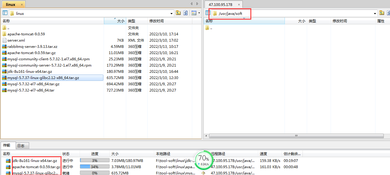 通过xftp传输下载的mysql、jdk1.8、tomcat安装文件至soft目录下。