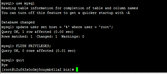 update user set host = '%' where user = 'root'; #使root能再任何host访问
