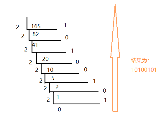 通常采用短除法,让十进制不断被二整除,可以得到多个余数,最后将得到的余数从下到上排列,即可得到二进制数。例如:将十进制数165转换为二进制数。计算过程如图所示: