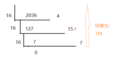 让十进制不断被16整除,可以得到多个余数,最后将得到的余数从下到上排列,即可得到十六进制数。例如:将十六进制数2036转换为二进制数。计算过程如图所示:
