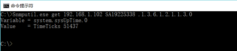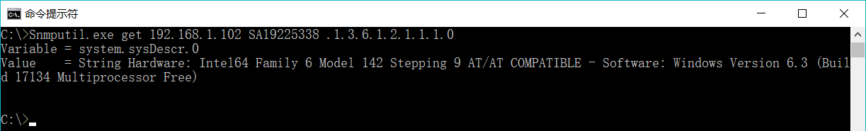 如下图所示,我把Snmputil.exe放置在了C盘,在192.168.1.102电脑上设置的团体字为:SA19225338,以下为获取192.168.1.102设备的描述信息的打印结果。其中.1.3.6.1.2.1.1.1.0为设备描述的oid