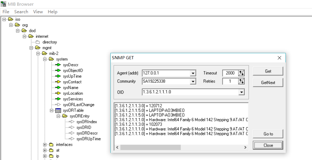 网络上可视化管理工具比较多,使用起来更为方便简单,可以作为检测代码的对照工具,下面我以MIB Browser为例:
