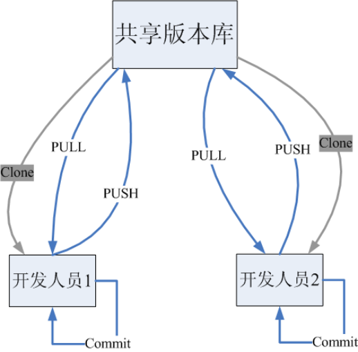 Git是分布式版本控制系统,那么它就没有中央服务器的,每个人的电脑就是一个完整的版本库,这样,工作的时候就不需要联网了,因为版本都是在自己的电脑上。既然每个人的电脑都有一个完整的版本库,那多个人如何协作呢?比如说自己在电脑上改了文件A,其他人也在电脑上改了文件A,这时,你们两之间只需把各自的修改推送给对方,就可以互相看到对方的修改了。下图就是分布式版本控制工具管理方式:
