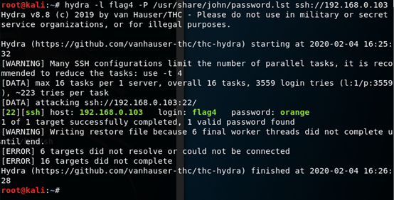 flag提示find,shadow等,cat了一下passwd文件,发现了一个flag4的用户,猜测下一个flag在这里,然后使用hydra + John the Ripper的密码本进行爆破