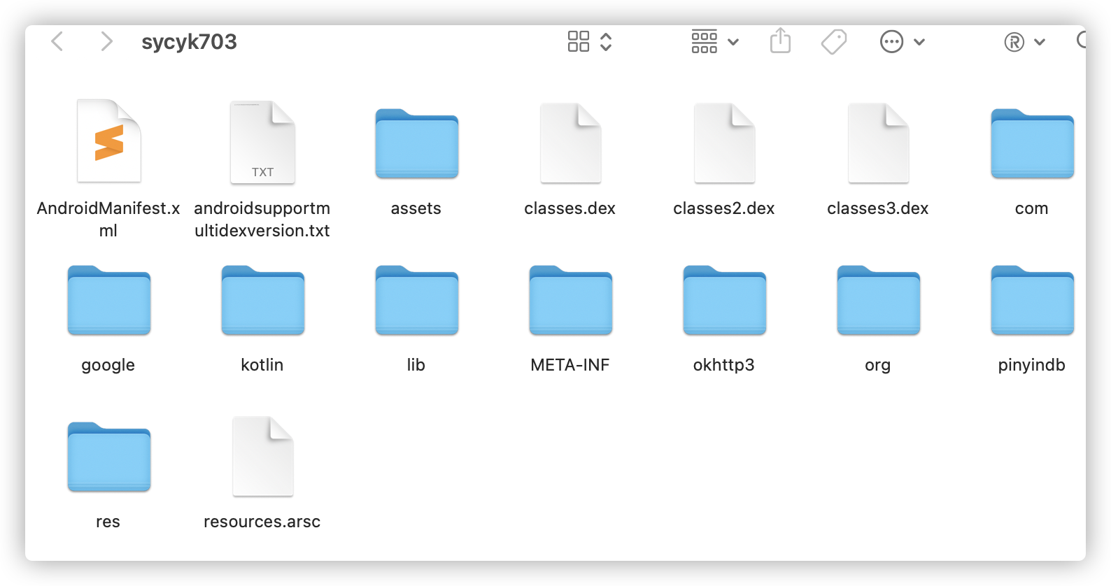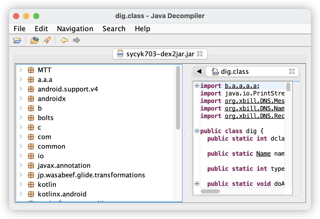 然后进行反编译,将apk当成zip解压,得到classes.dex文件,如果里面只有一个的话,可以直接使用dex2jar得到jar文件,我这里有多个