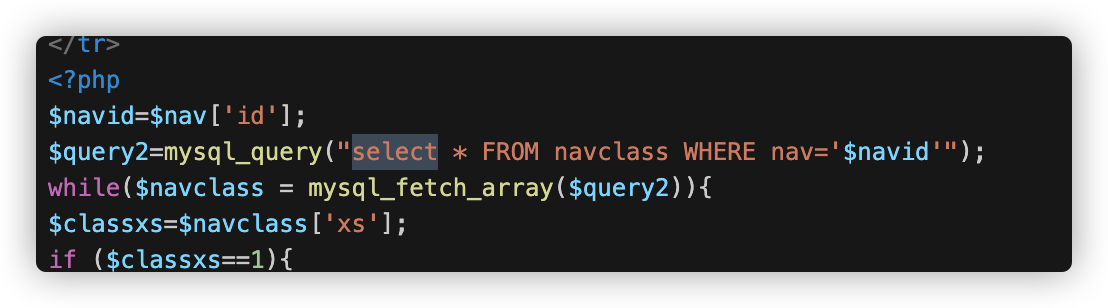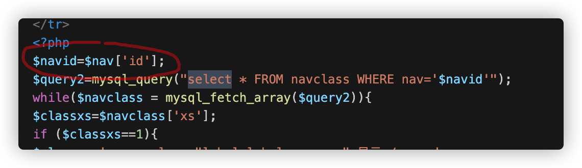 然后将查询出的$nav的id值赋值给$navid,中间无法控制,