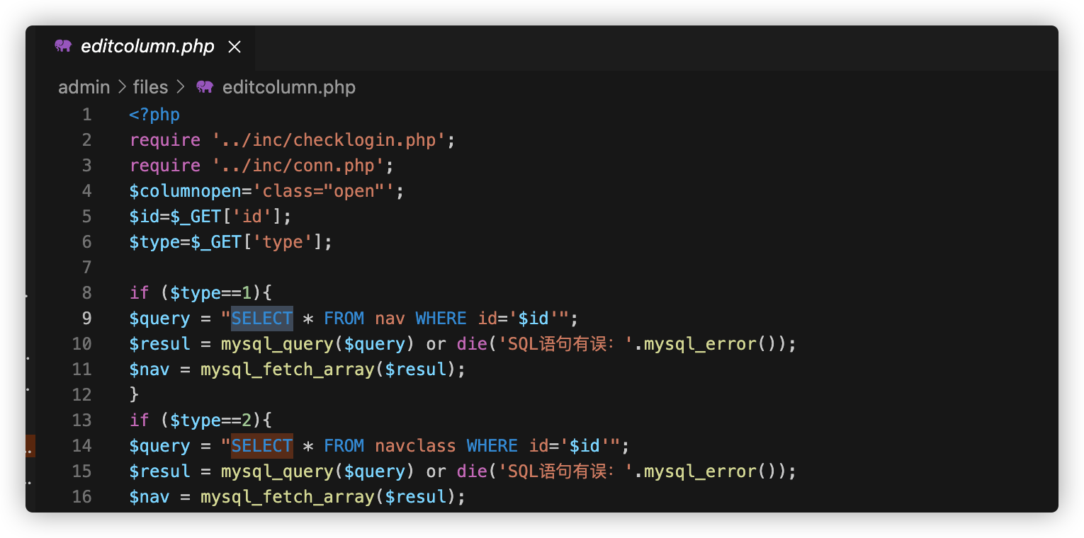 在columnlist.php中发现了一个查询语句
