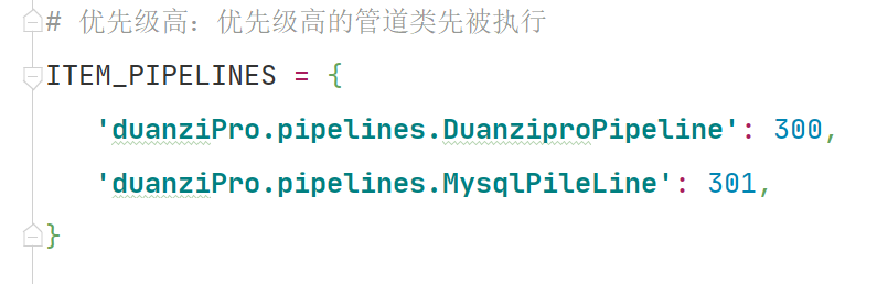 补充:一个管道内对应一种形式的持久化存储操作,如果将数据存储到不同的载体中就要使用多个管道类,item不会依次提交给三个管道,爬虫文件中的item只会被提交给优先级最高的那个管道类,所以优先级高的管道类需要在process_item中实现return item,这样一来就将item传递给下一个即将被执行的管道类。