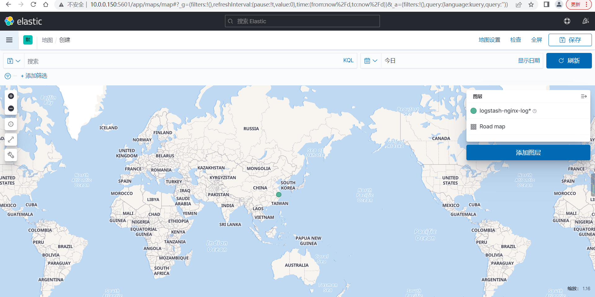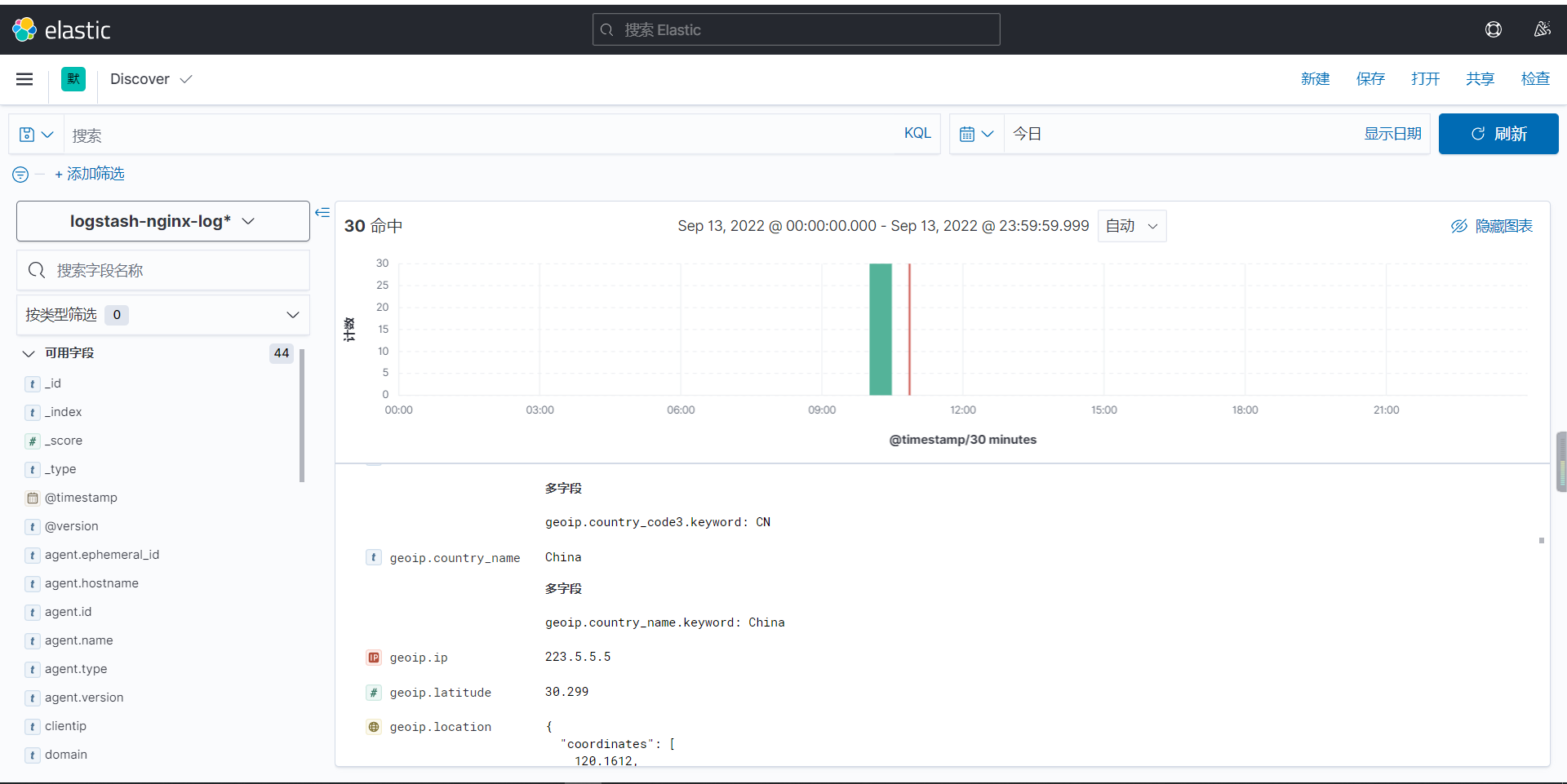 5.#在kibana验证查看数据。并在地图中查看用户公网ip所在城市情况