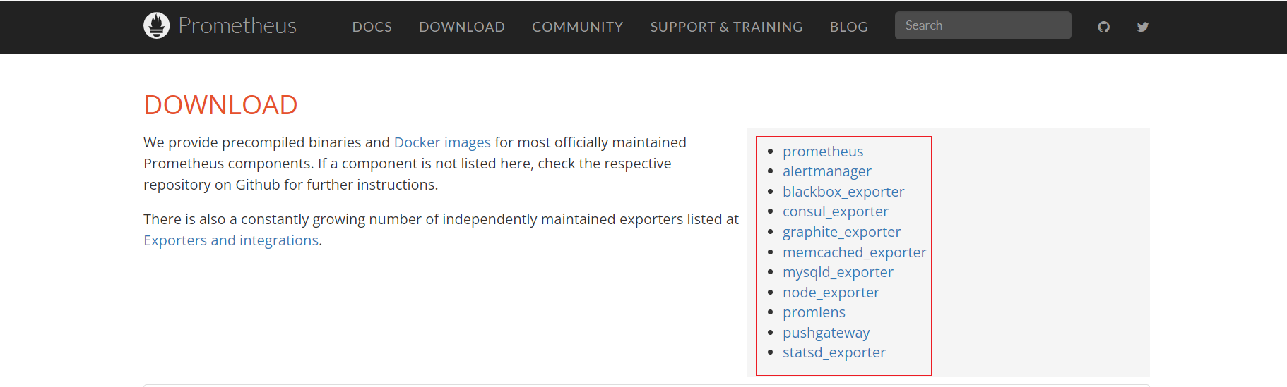 prometheus本身并不具备抓取各种数据的能力,需要依赖exporter,node_exporter的下载页面和prometheus相同:https://prometheus.io/download/ ,右侧列出的就是prometheus支持的所有exporter插件,注意node_exporter插件应安装在需要监控的linux服务器上,